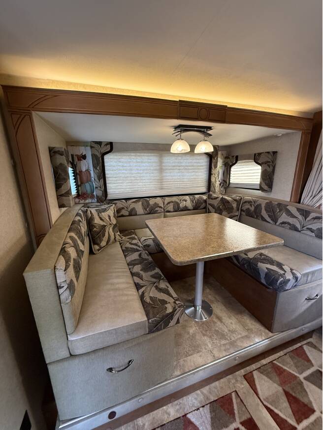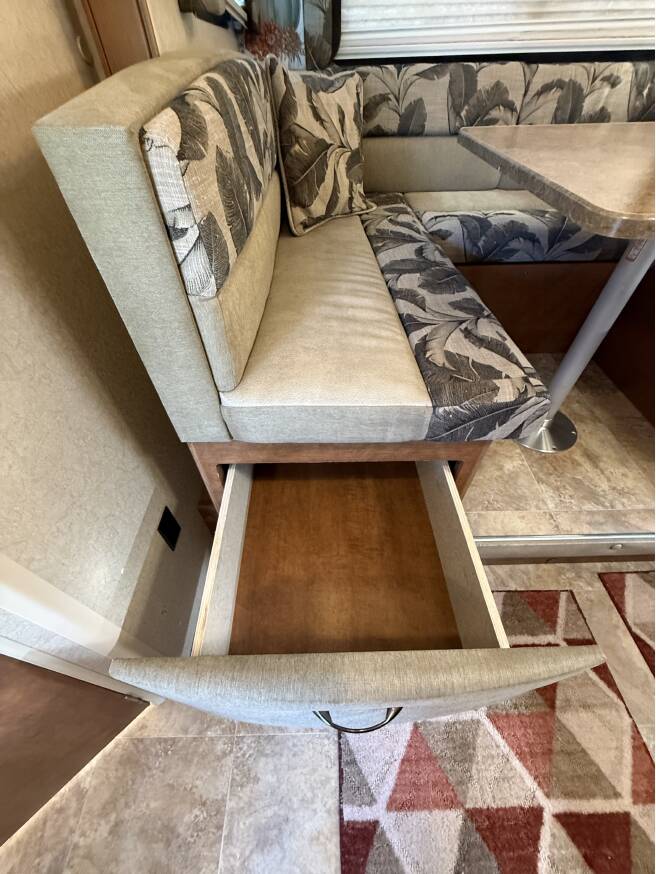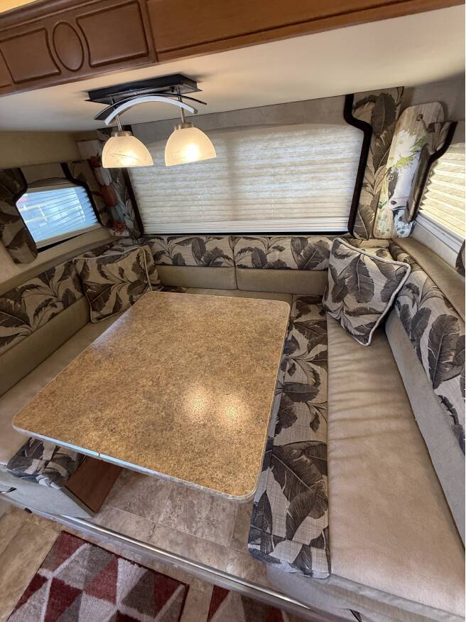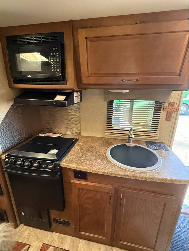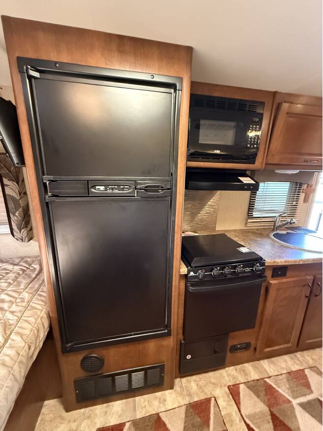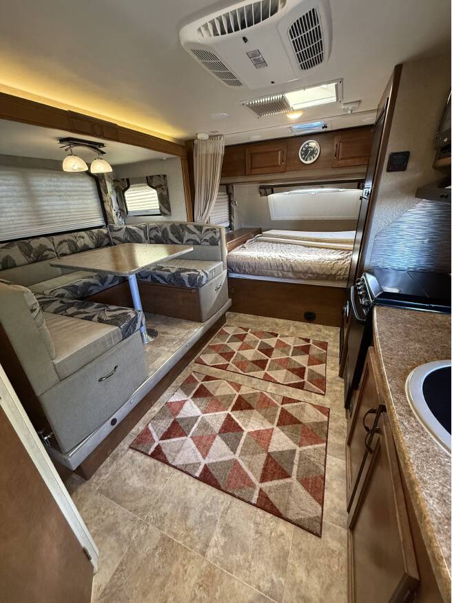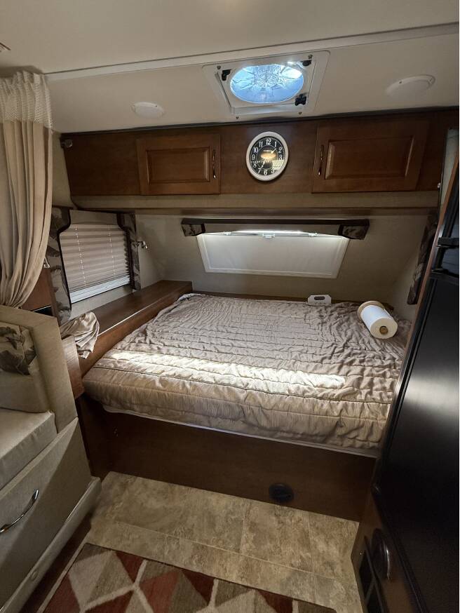 Step inside the 1685 and be greeted by an intelligently-designed spacious interior that maximizes every square inch for your comfort. Featuring a well-equipped kitchenette, complete with a 4 burner stove, microwave, and refrigerator (which runs on battery, propane and electricity), meal preparation on the road will always be a breeze. The carefully appointed dinette offers a welcoming space to enjoy your meals and unwind after a day filled with adventure. As you move towards the rear, the comfortable sleeping quarters ensure a restful night’s sleep, with ample storage throughout to keep your travel essentials neatly tucked away.